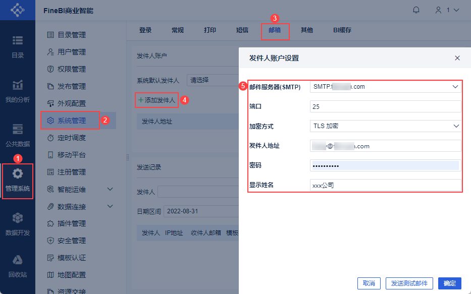 管理员需要先设置一个发件人,用于发送邮件,设置步骤请参见:邮箱 。如下图所示:
