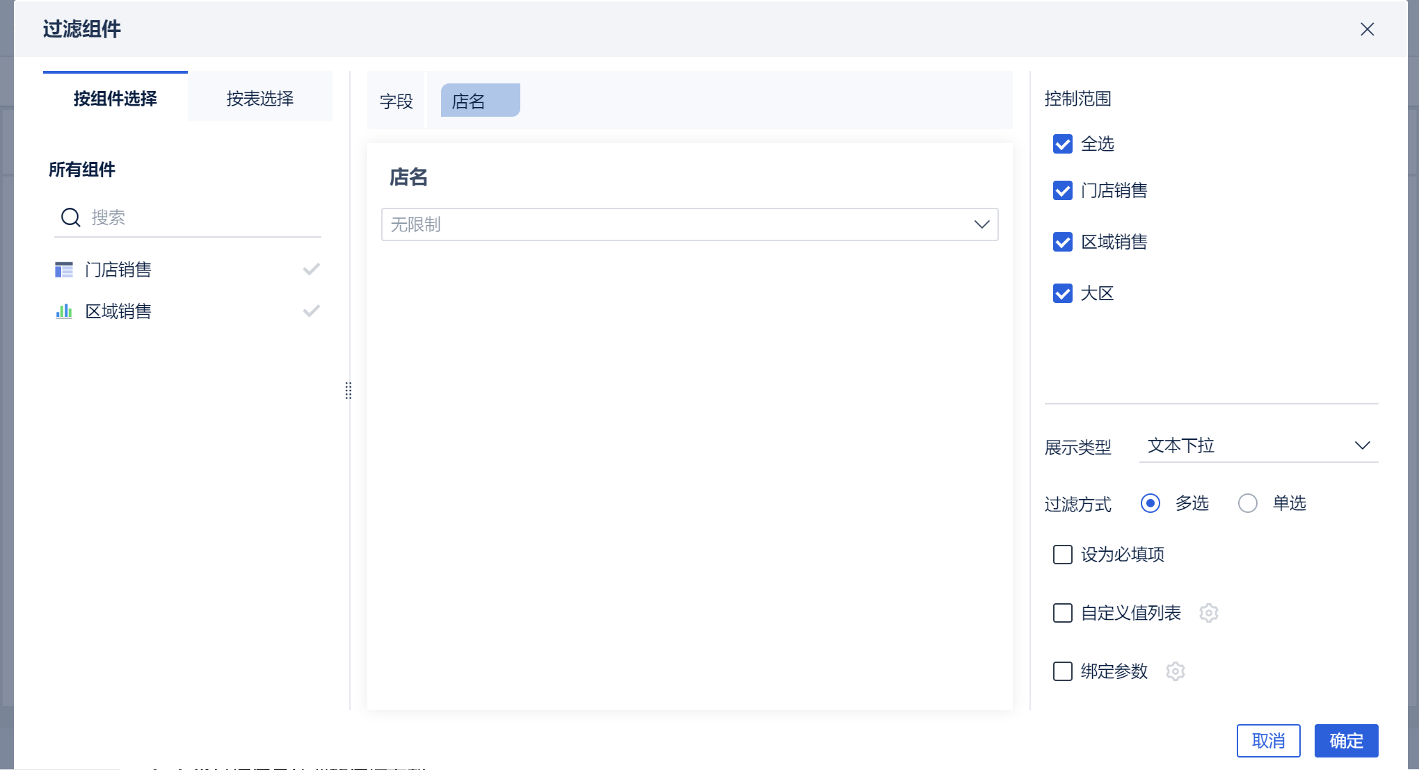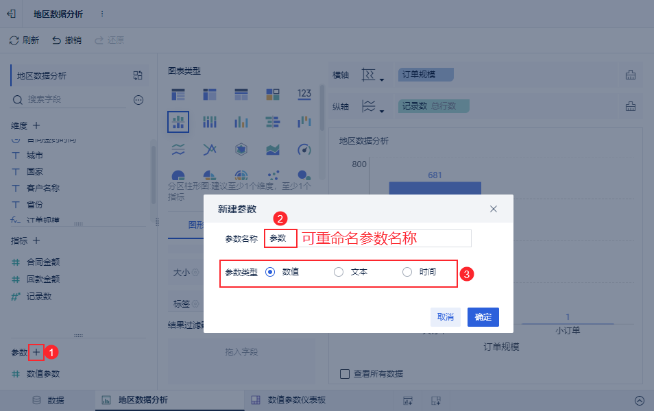 支持在组件内创建参数,参数类型包括日期、文本、数值;支持在字段明细过滤、字段过滤、计算字段内绑定(使用)此参数,同时一个过滤组件可以绑定多个参数。