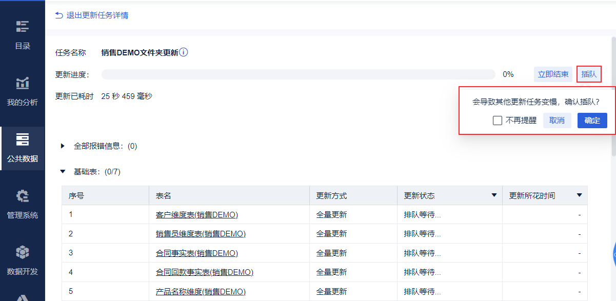 当前正在执行耗时较长的更新任务时,出现一个紧急更新任务,BI 支持超级管理员让正在排队等待的任务插队更新。