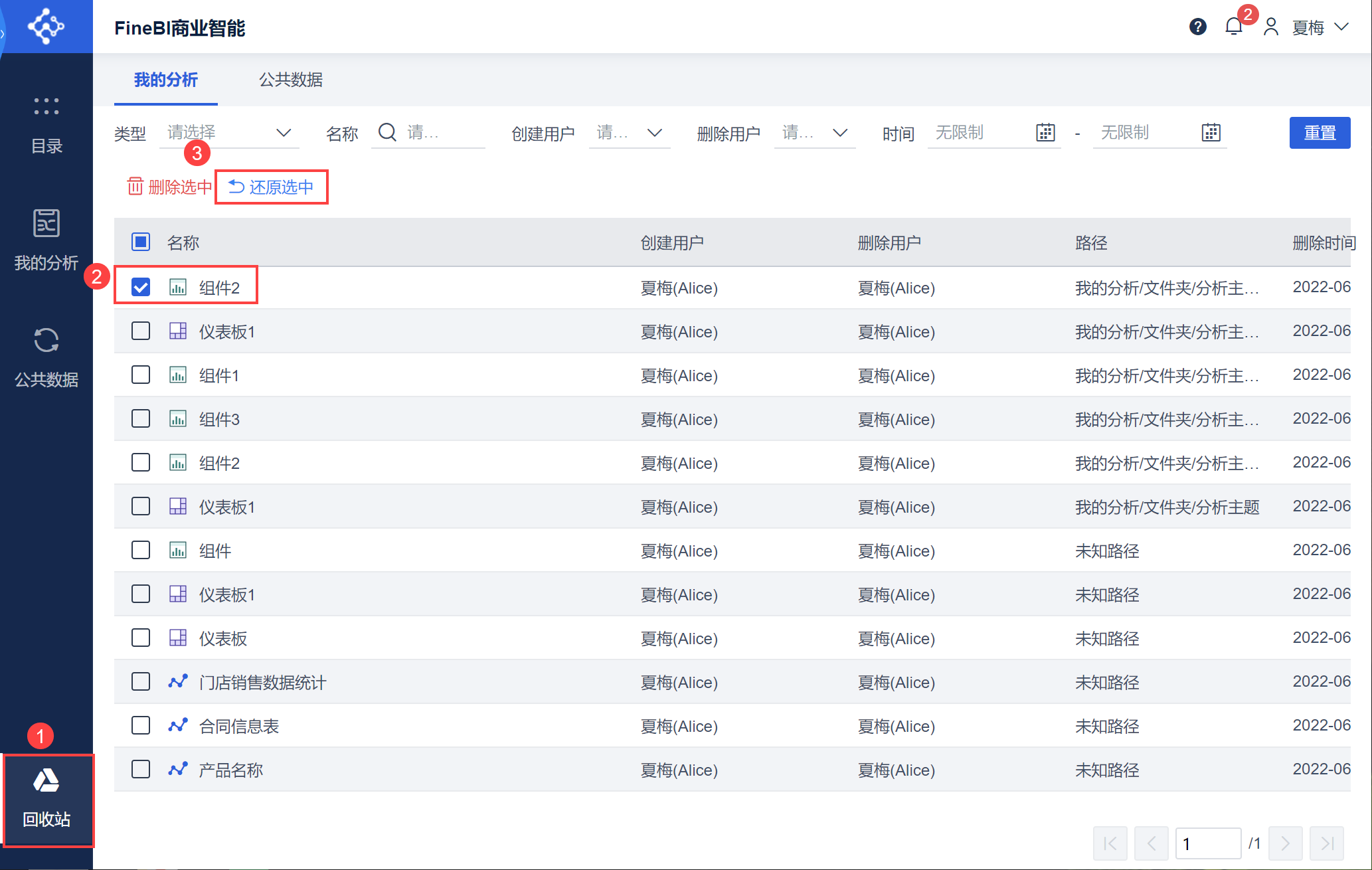 被删除的数据、组件、仪表板都可以在回收站中找到并且还原。