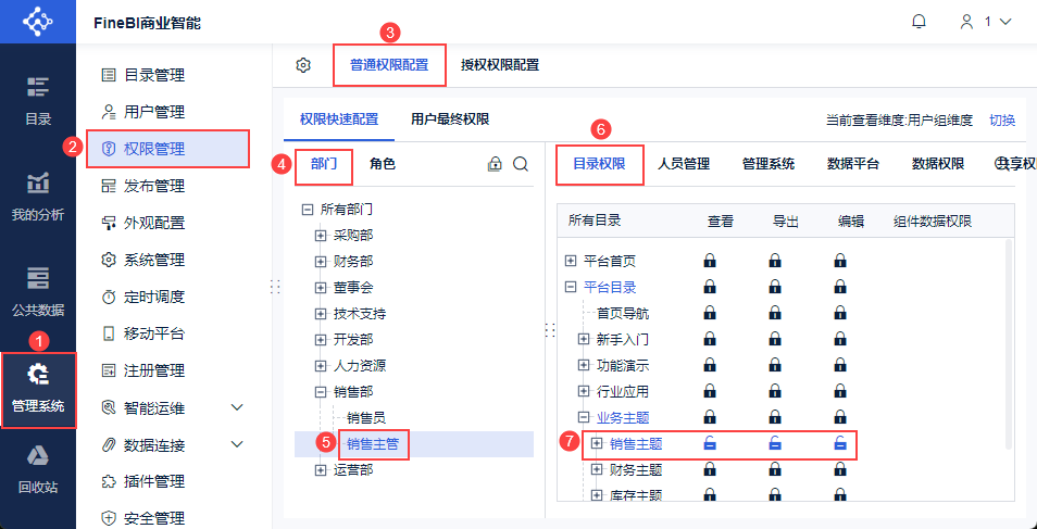 | 示例二 | 给「销售部>销售主管」分配目录「销售主题」的「编辑」权限 使得销售主管可以在「销售主题」目录下挂载销售部员工的模板 | 1)开启「分级授权」,开启「目录编辑」。 2)给权限载体分配「目录权限」的「编辑」权限。 3)给权限载体分配「管理系统>目录管理」的「使用」权限。 4)给权限载体分配「人员管理」中仪表板创建者所在部门/角色的「管理」权限。 5)仪表板创建者申请发布 BI 仪表板。 |