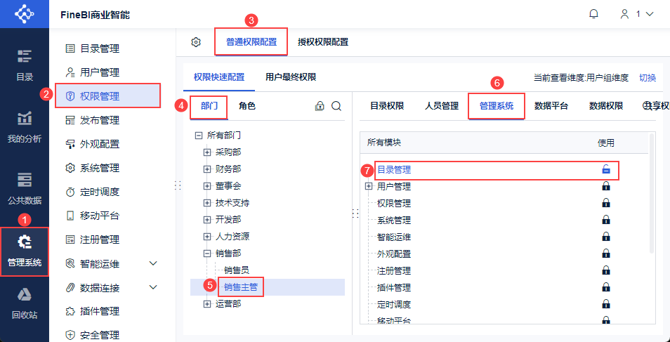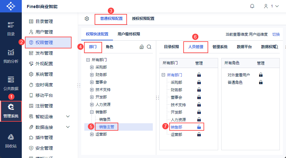 管理员登录FineBI系统,点击「管理系统>权限管理>普通权限配置」,选择权限载体「部门/角色/用户」。