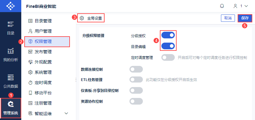 管理员登录FineBI系统,点击「管理系统>权限管理>全局配置」。开启「分级授权」,开启「目录编辑」。如下图所示: