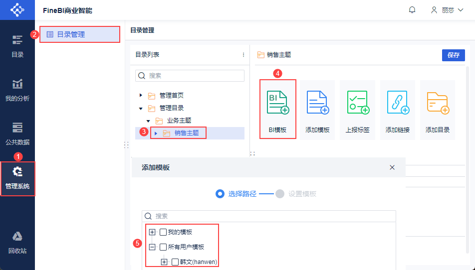 销售主管Lisa(Lisa,1)登录FineBI系统,点击「管理系统>目录管理」,选择目录「销售主题」。