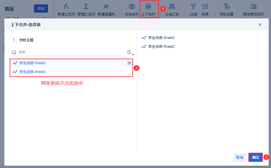 有「学生成绩」的三张 Excel 表,在数据中,选择 「学生成绩-Sheet1」字段,通过「上下合并」添加「学生成绩-Sheet2」字段,完成上下合并其中两张的操作。如下图所示:
