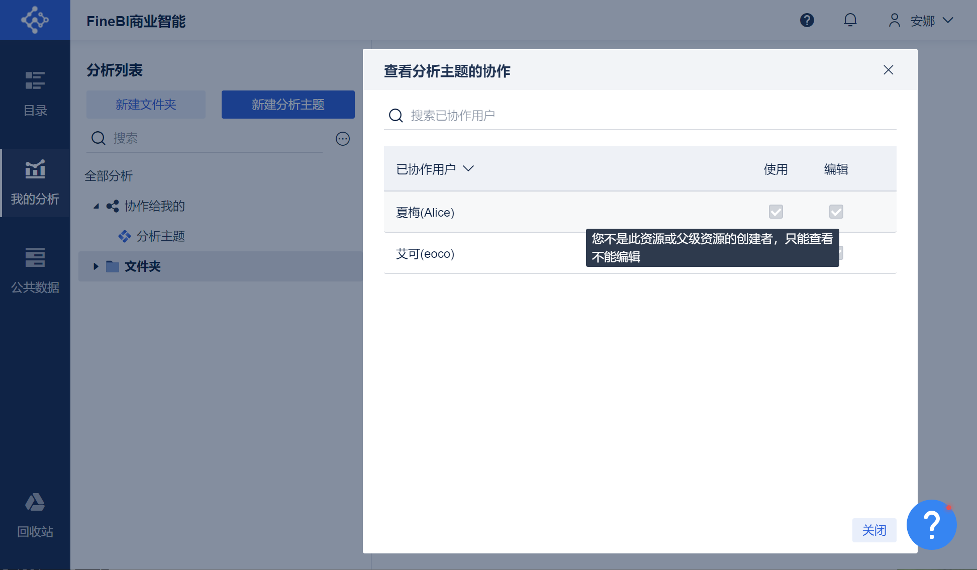 FineBI 支持协作功能,将文件夹或者分析主题协作给其他设计用户。