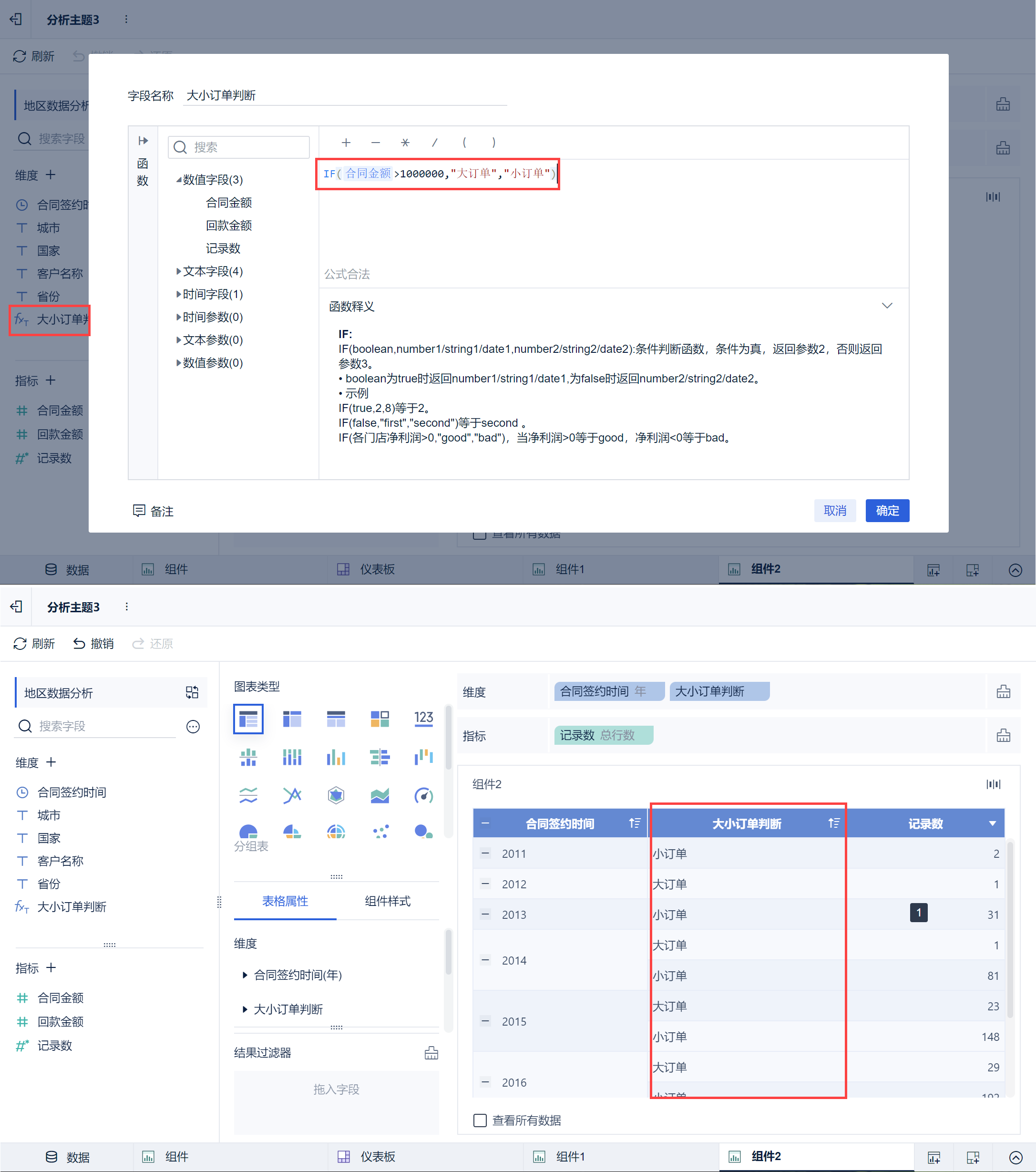 例如:用户使用计算字段增加一个新的维度字段,当「合同金额」大于1000000 时是大订单,如下图所示:
