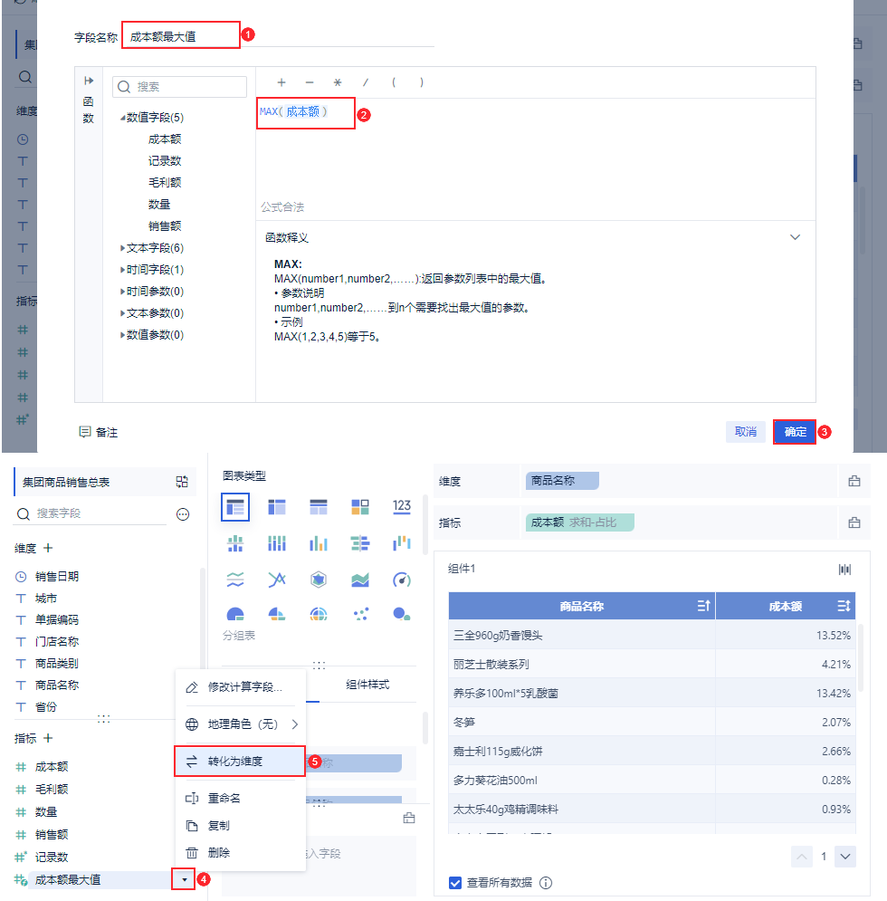 注:当计算字段进行过维度指标转化后,不再支持待分析维度/指标的操作,不可以编辑;复制的计算字段被复制后,该字段支持的操作与被复制的字段一致。