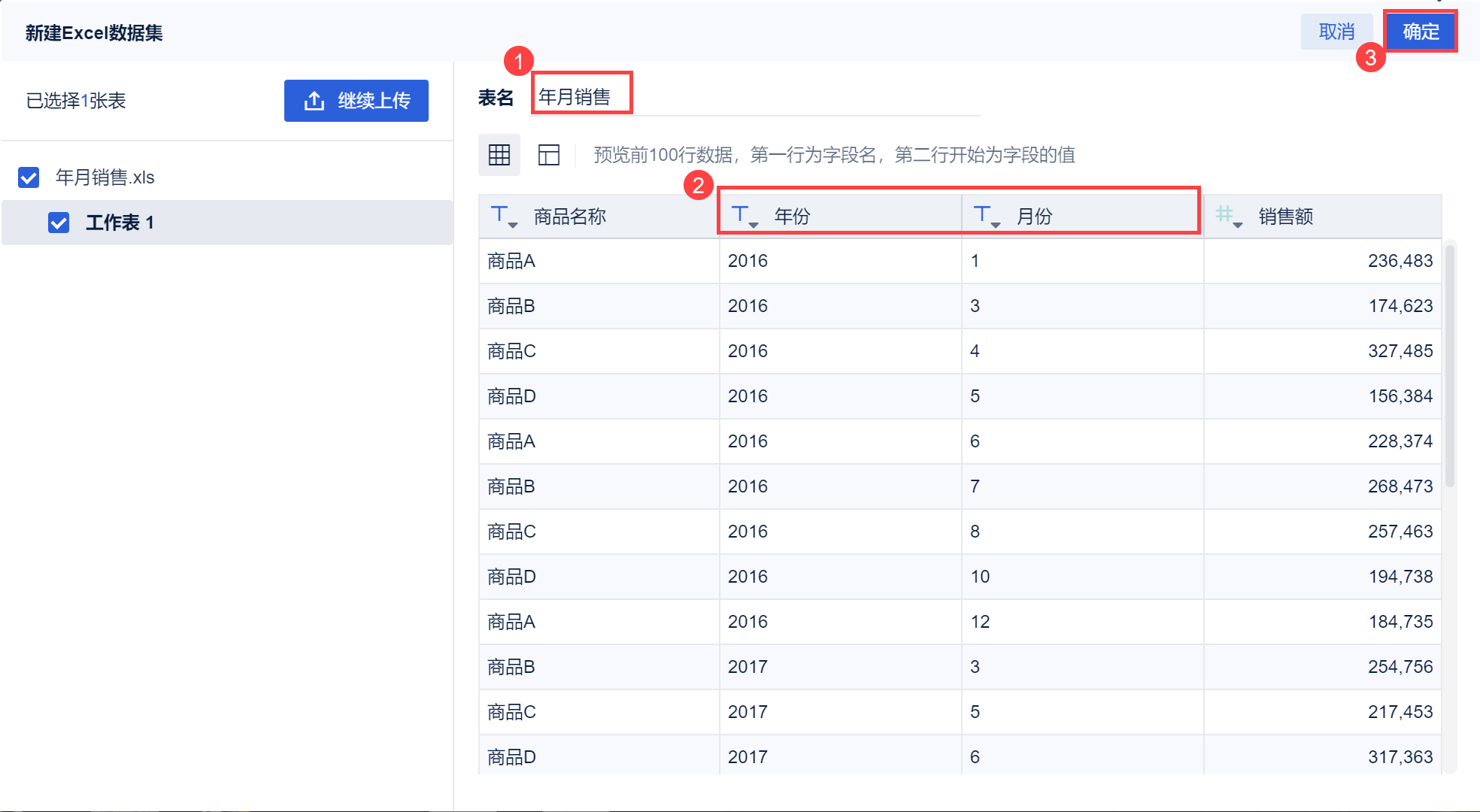 4)将「月份」也修改为「文本」字段,之后填写表名,点击「确定」,完成数据上传。如下图所示: