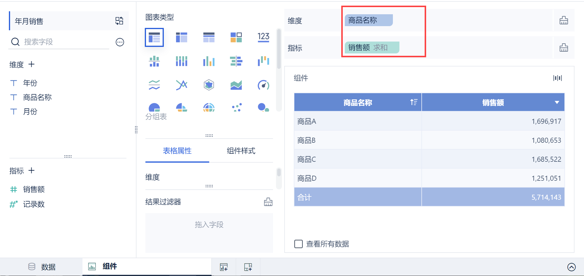 1)先将「商品名称」和「销售额」拖入维度指标栏,如下图所示: