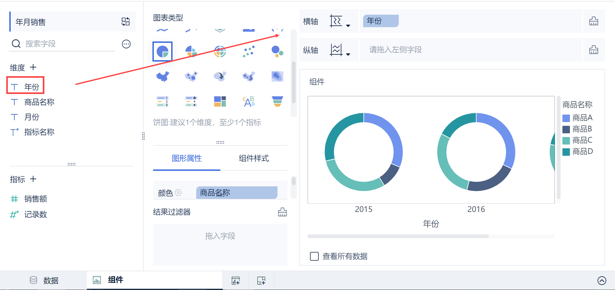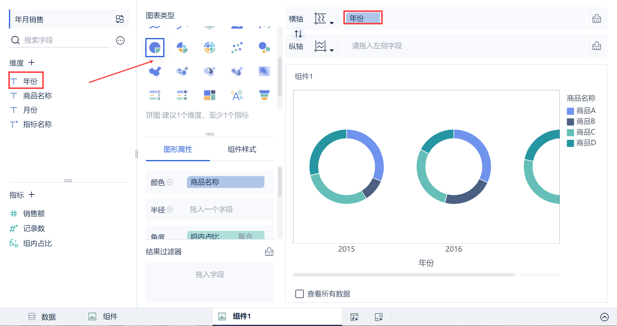 2)显示的饼图需要按「年份」,进行分类展示,则在维度字段拖入「年份」,如下图所示: