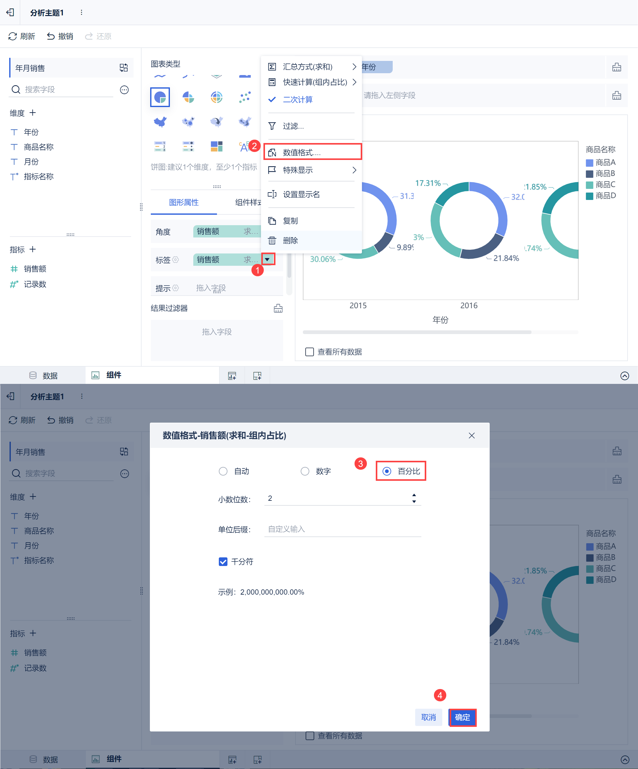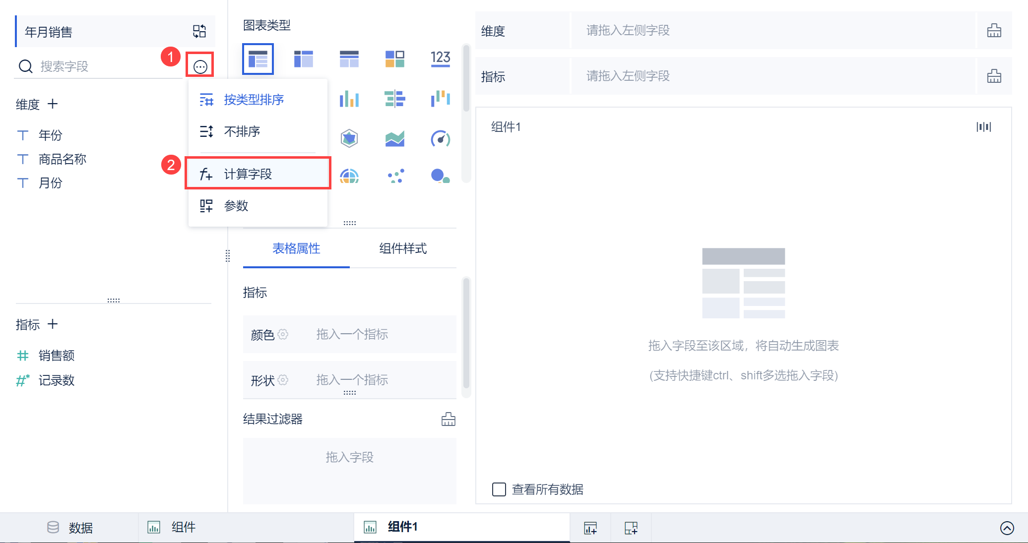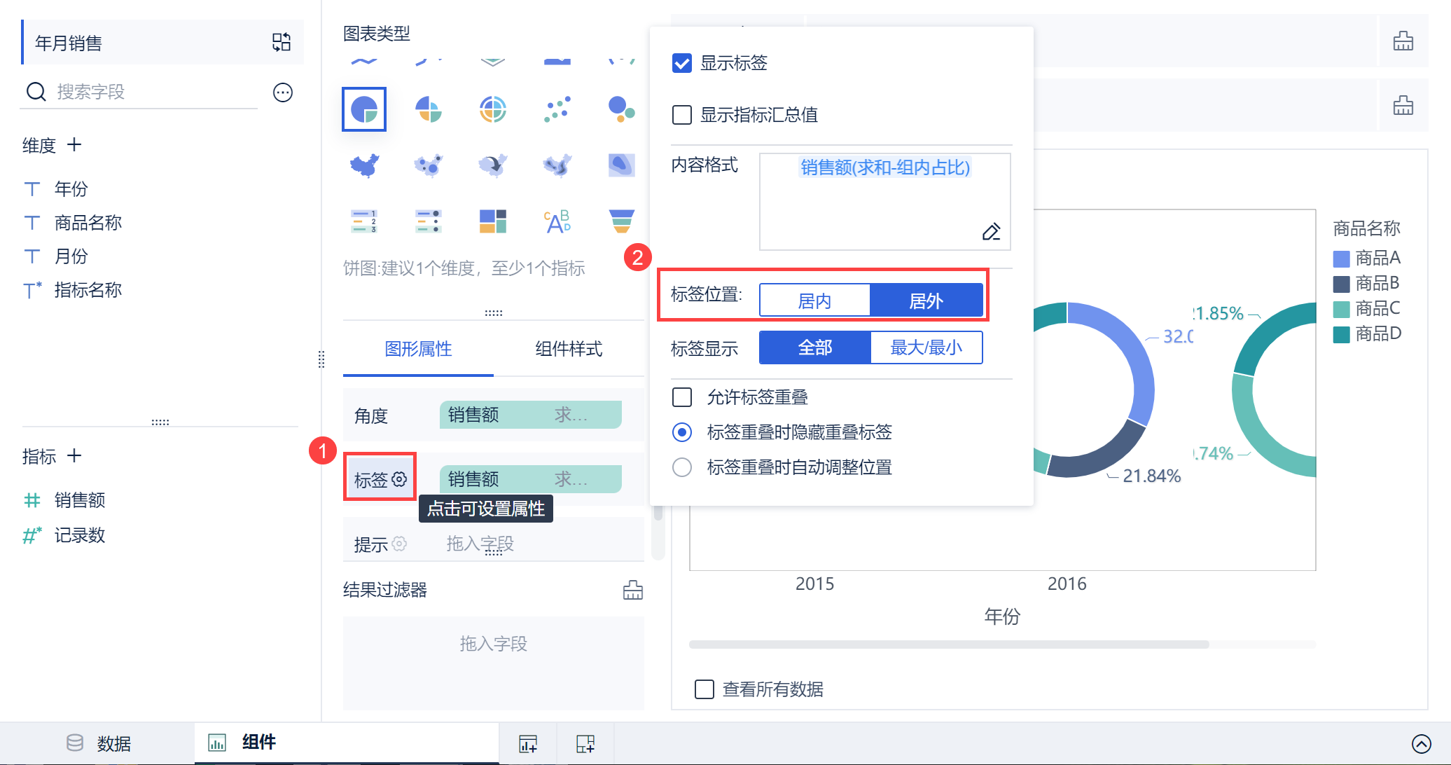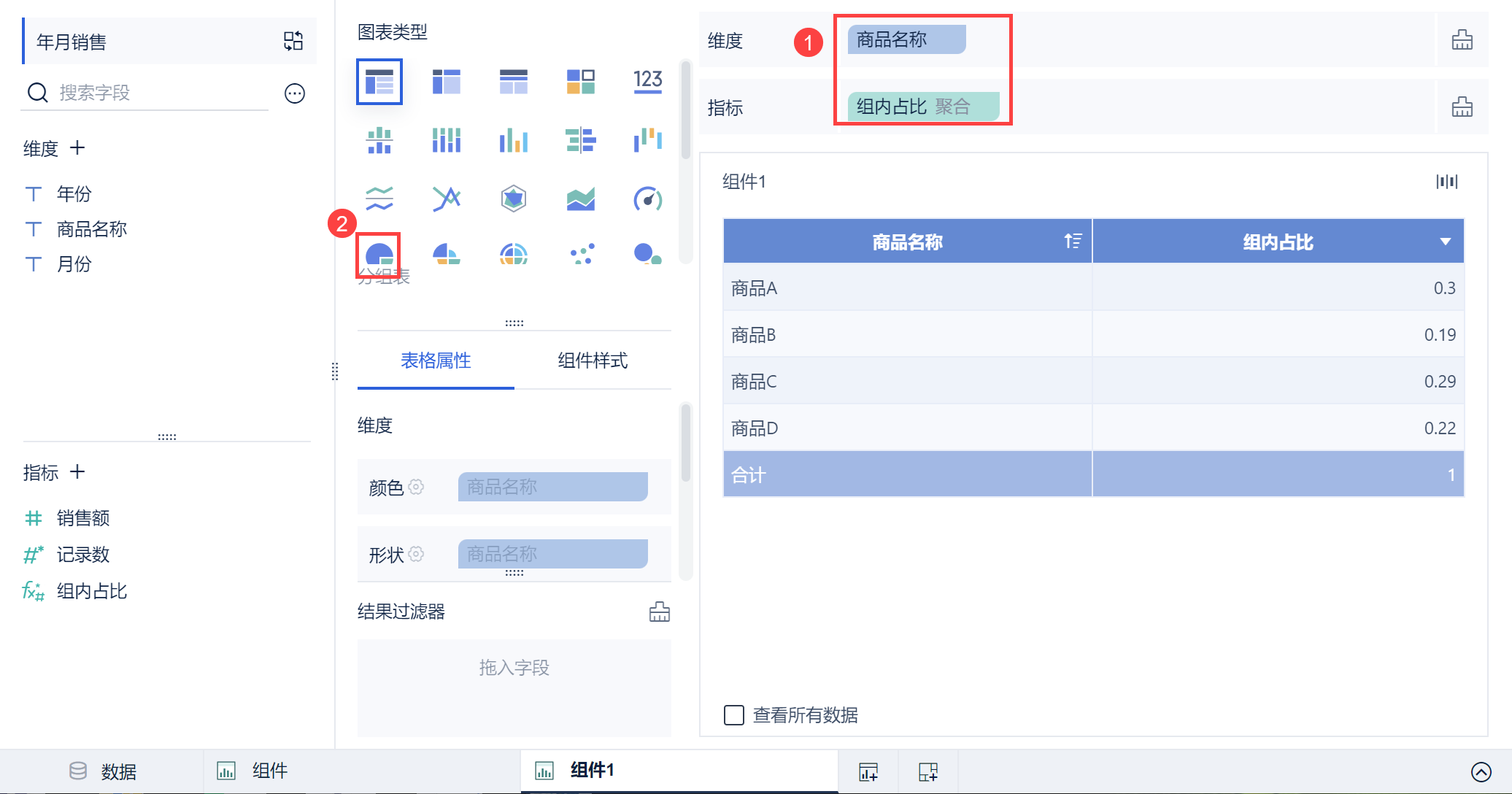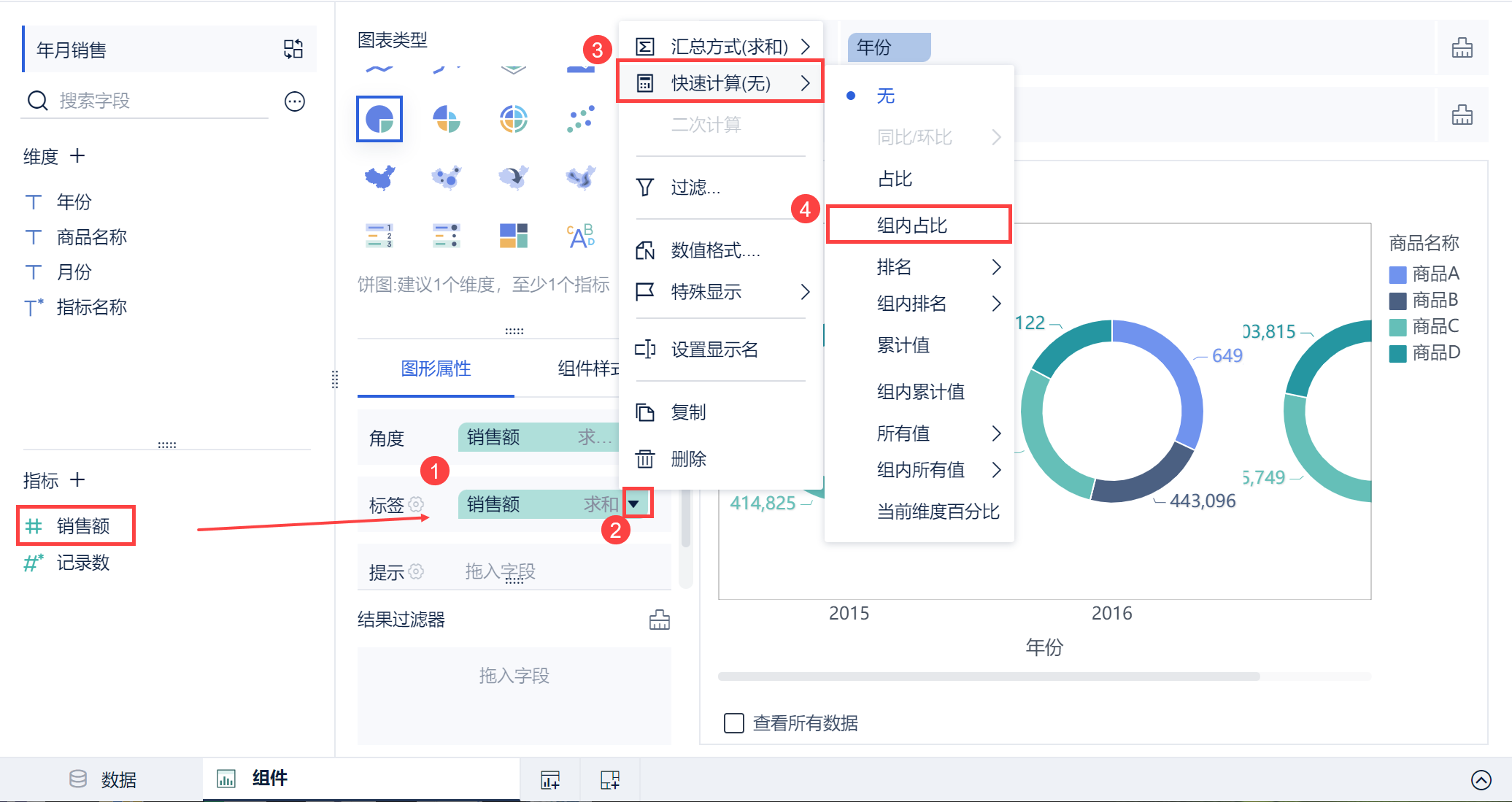 | 是 | 数据集中存在销售额,求近几年内各类商品的销售额占比。 | 计算组内占比-指标(本文) 指标是指组件制作中待分析区域的指标栏字段,一般是数值形式。 |