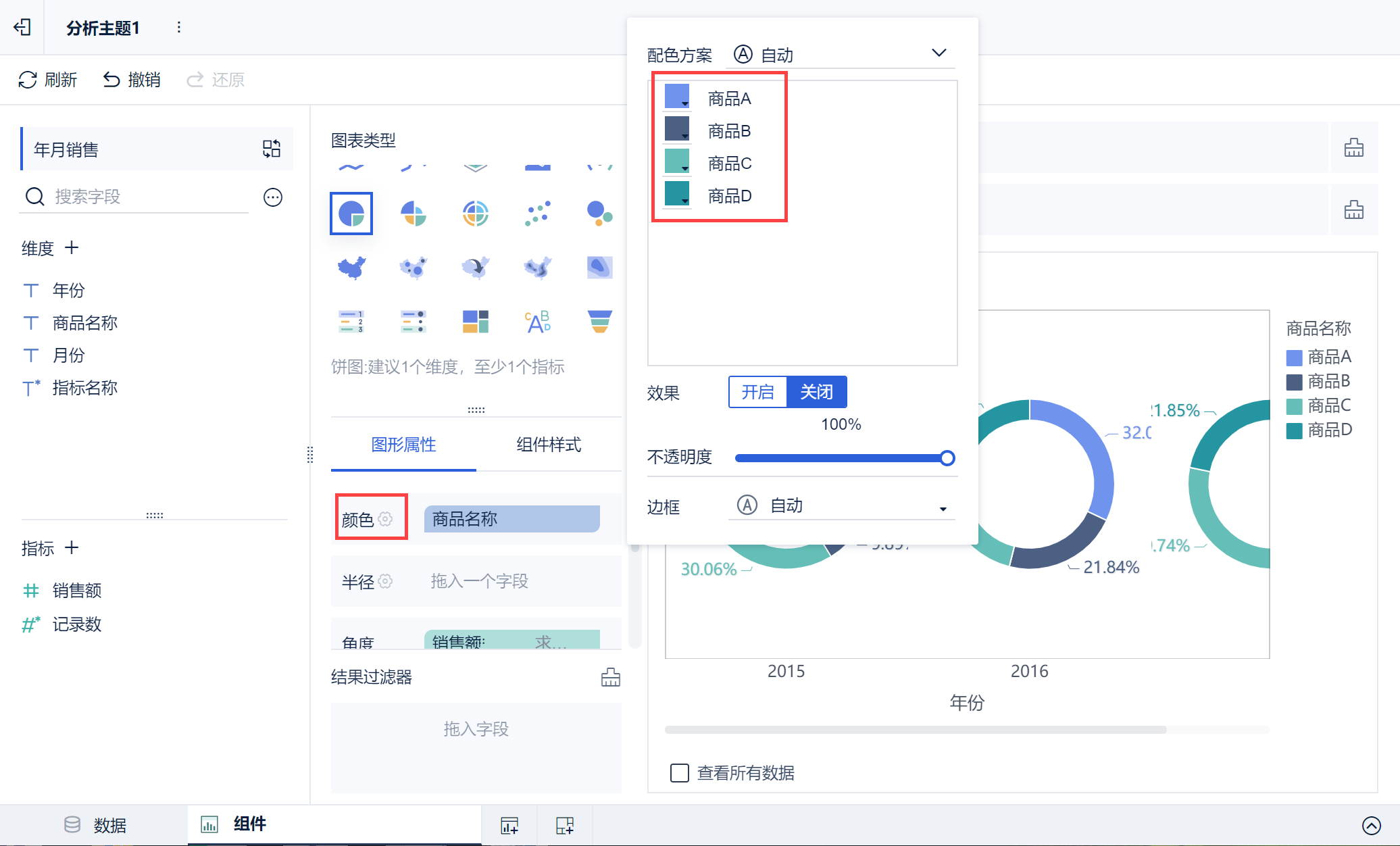 预期效果是按「商品名称」查看「销售额」,按「年份」进行分组。由于饼图制作需要一个维度和一个指标,可先使用「商品名称」和「销售额」将图表变成饼图,再拖入「年份」对「商品名称」进行分组进行饼图的详细制作。