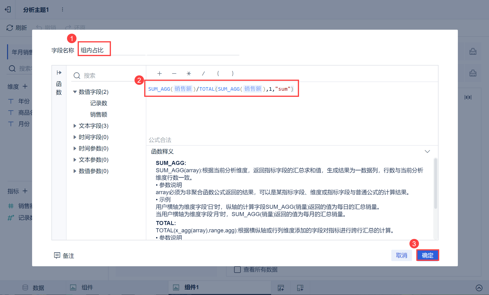 2)添加公式:SUM_AGG(销售额)/TOTAL(SUM_AGG(销售额),1,"sum"),用分组汇总的销售额比上总销售额得出占比,并命名计算指标为「组内占比」,完成点击「确定」。如下图所示: