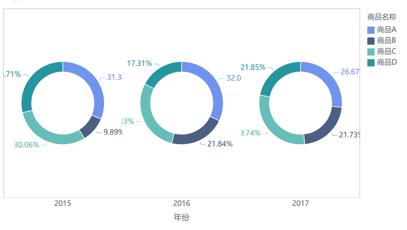 4)实现饼图效果后,再将「年份」拖入横轴,图表预览界面则实现分组占比效果,即得出各年内,每种商品的销售额占比分析结果。如下图所示: