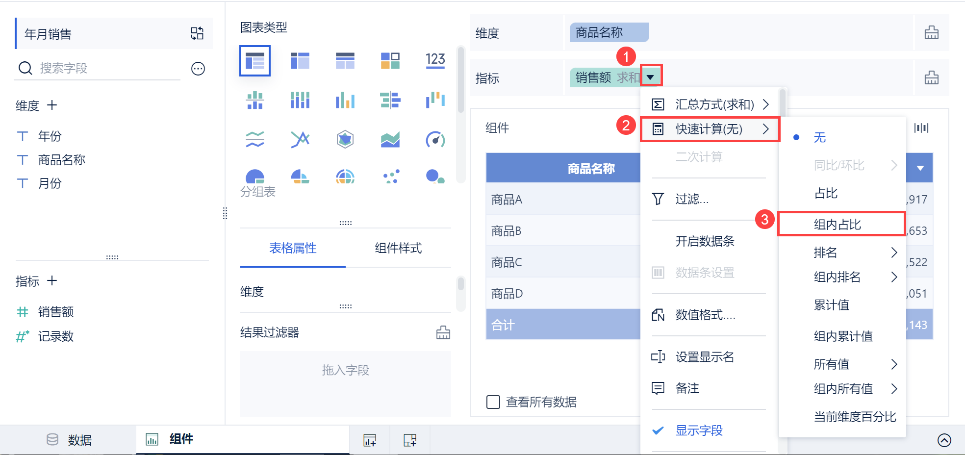 」下拉按钮进行「快速计算>组内占比」,来获取组内占比的指标数据。实现方式更快捷。如下图所示: