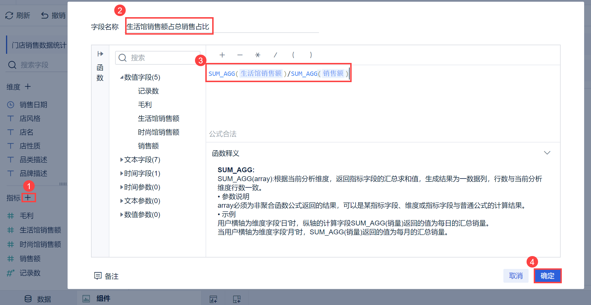 1)添加计算字段,命名为「生活馆销售额占总销售占比」,输入公式:SUM_AGG(生活馆销售额)/SUM_AGG(销售额),点击「确定」,如下图所示:
