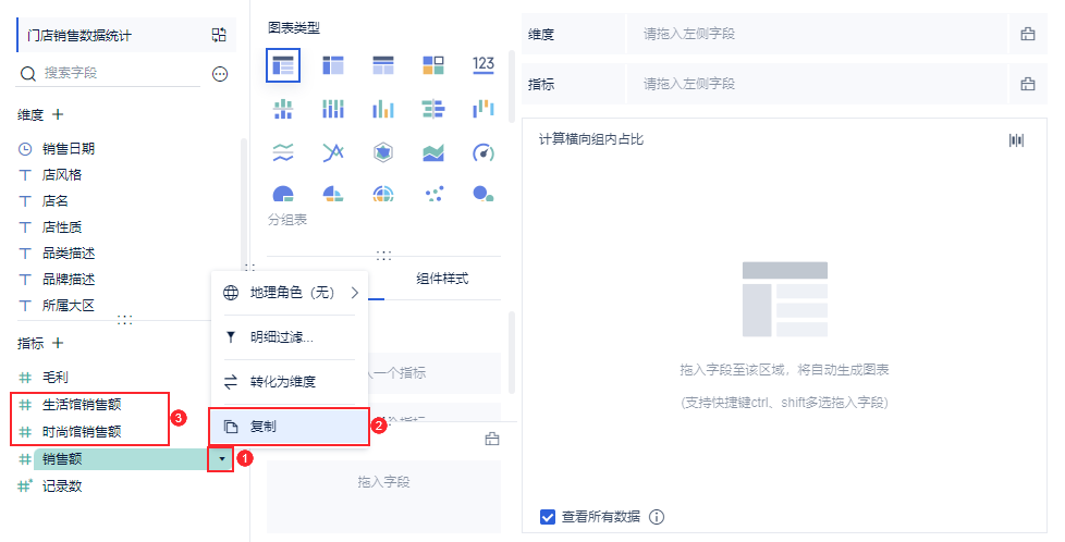 2)复制待分析区域的「销售额」字段,并为复制的指标分别命名为「生活馆销售额」和「时尚馆销售额」,如下图所示: