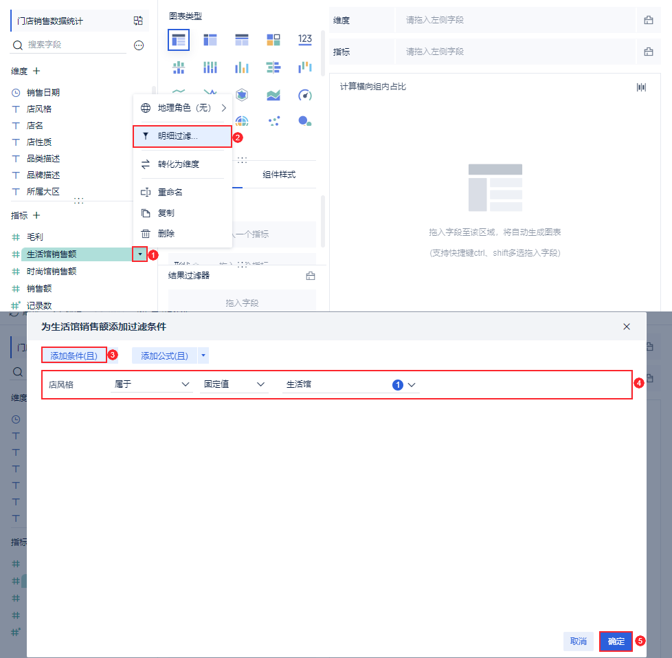 3)对「生活馆销售额」进行「明细过滤」,设置过滤条件为「店风格属于生活馆」,点击「确定」,如下图所示: