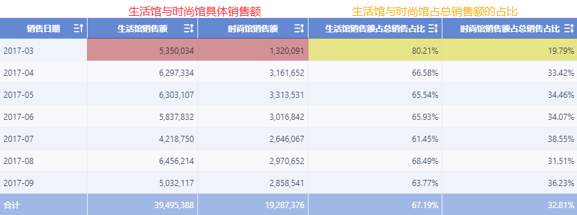 例如 2017-05 月,生活馆占比:66.25%=3614113/(3614113+1840913)*100%;时尚馆占比:33.75%=1840913/(3614113+1840913)*100%