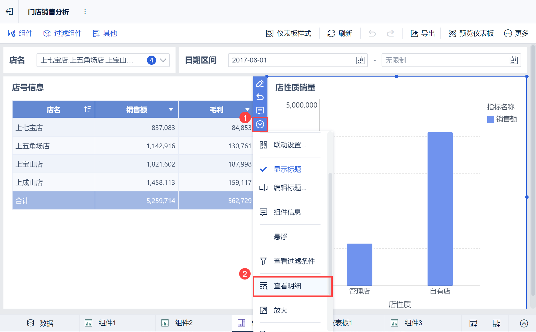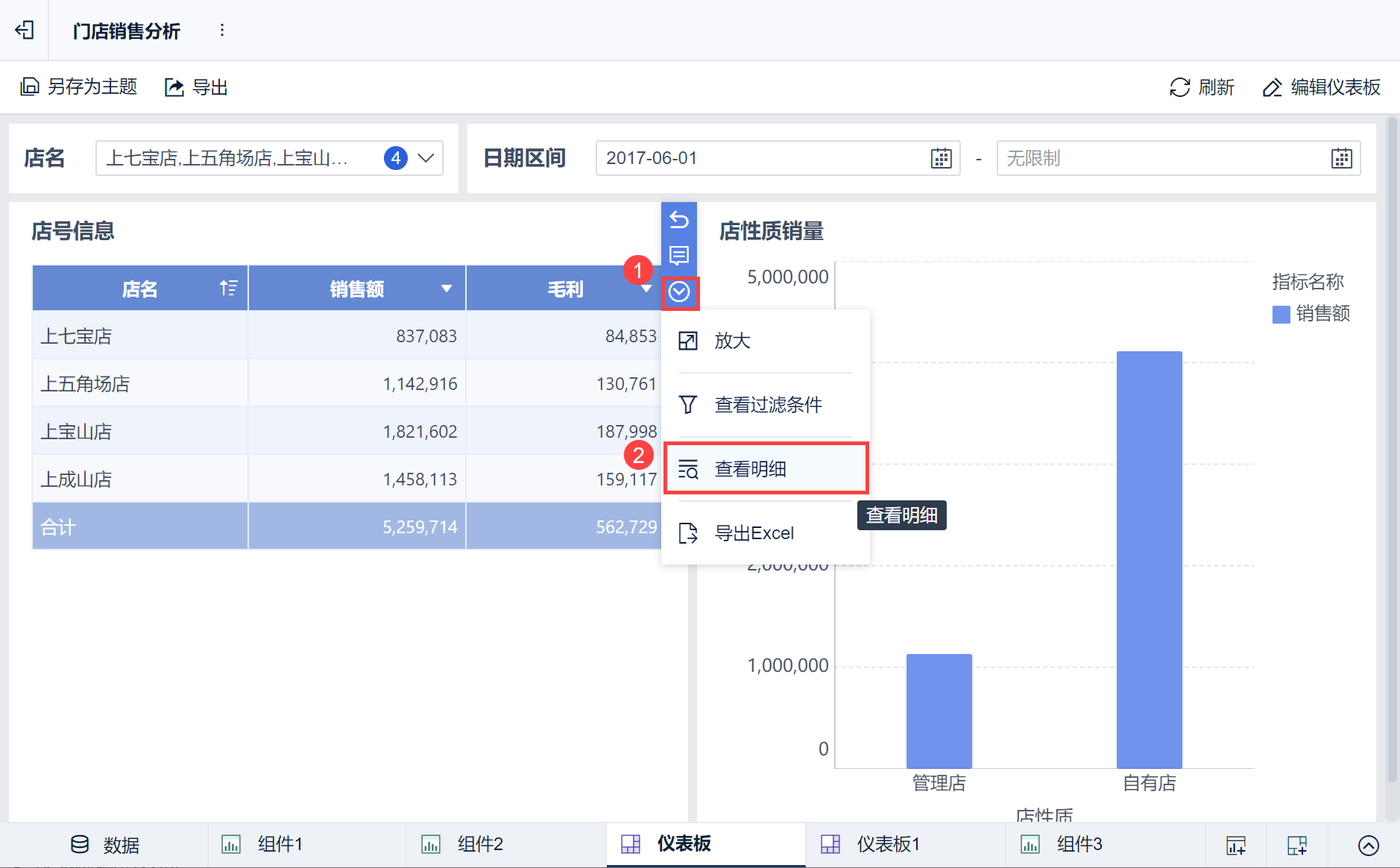 图表组件在仪表板预览界面和编辑界面,下拉点击「查看明细」来查看图表对应的明细数据。