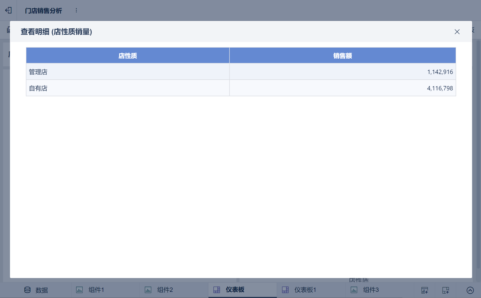 点击该「查看明细」按钮,则出现查看明细的窗口,显示该图表对应的明细数据。为「店性质」和「销售额」明细表。如下图所示: