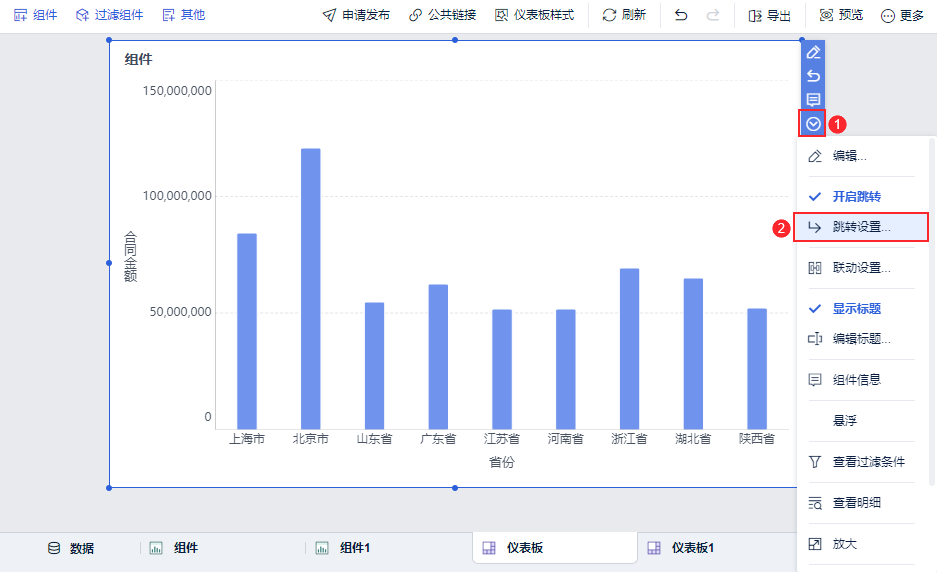 1)编辑「仪表板」,选择组件,点击下拉>跳转设置,如下图所示: