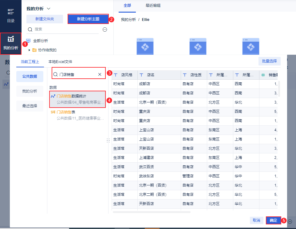1)新建分析主题,上传公共数据「门店销售数据统计」,如下图所示: