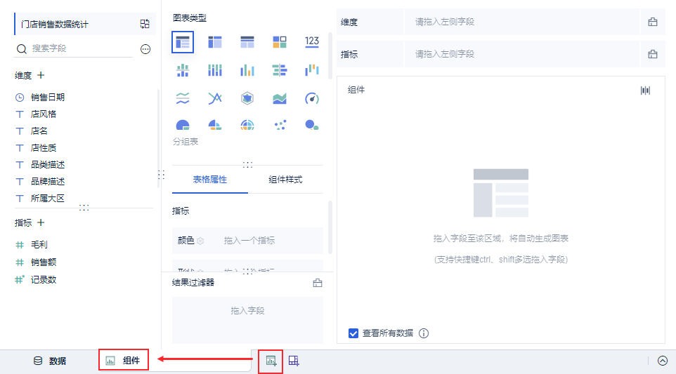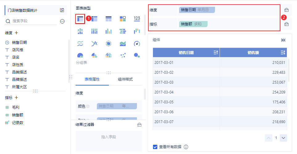 1)添加「分组表」,将「销售日期」、「销售额」分别拖入维度栏和指标栏,如下图所示: