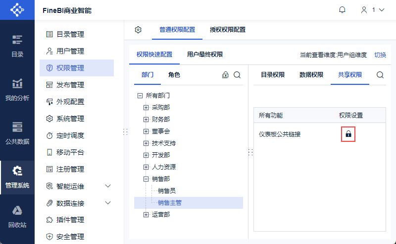 本章示例:给「销售主管」分配「仪表板公共链接」共享权限,使得销售主管可以将自己制作的仪表板生成公共链接,分享给任何人。