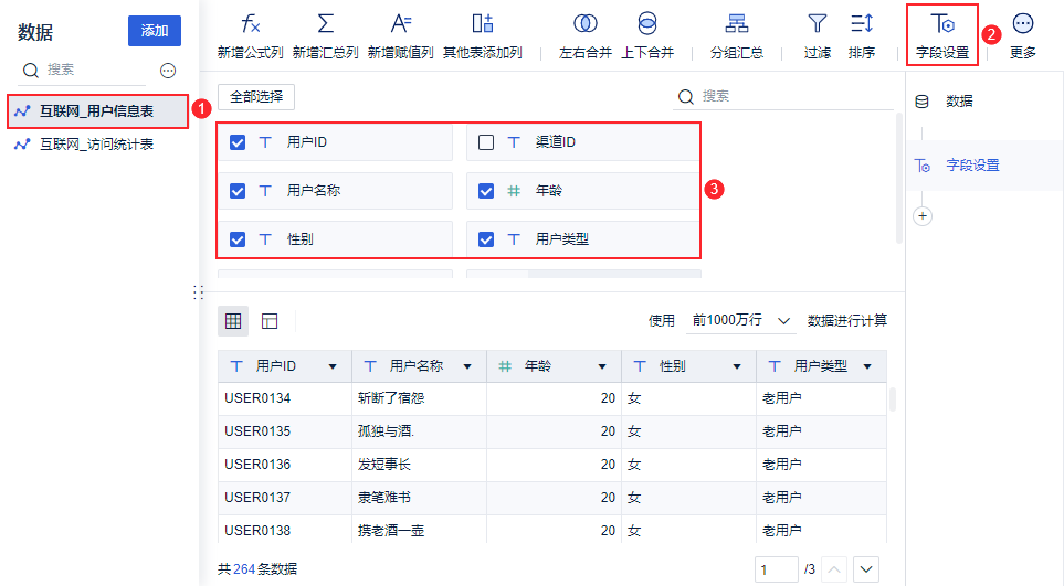 1)选择「互联网_用户信息表」,点击「字段设置」,选择「用户ID」、「用户名称」、「年龄」、「性别」、「用户类型」字段,如下图所示: