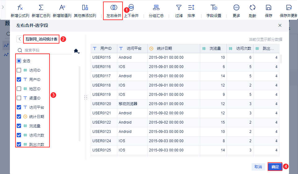 2)添加「左右合并」步骤,选择「互联网_访问统计表」下的「用户ID」、「访问平台」、「统计日期」、「浏览量」、「访问次数」、「跳出次数」、「总停留时间」,点击「确定」、如下图所示: