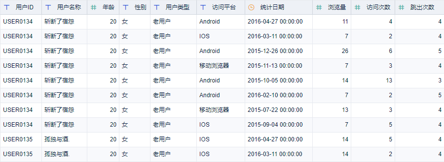 得到将不同用户的访问时间、访问次数、停留时间等信息根据「互联网_用户信息表」中「用户ID」进行匹配后的表,如下图所示: