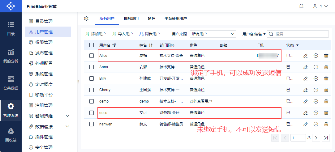 因此使用短信进行登录验证的用户,在数据决策系统中的用户信息,若未绑定手机,则短信无法成功发送。