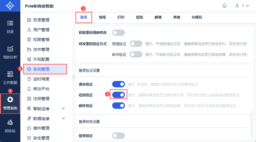 管理员登录FineBI系统,点击「管理系统>系统管理>登录」,在登录验证设置中,开启「短信验证」。如下图所示: