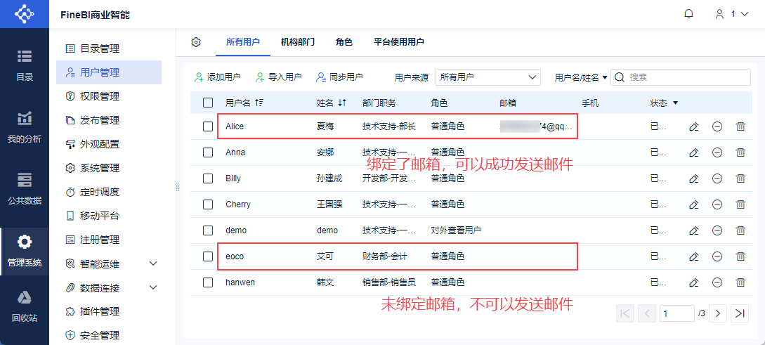 因此使用邮箱进行登录验证的用户,在数据决策系统中的用户信息,若未绑定邮箱,则邮件无法成功发送。