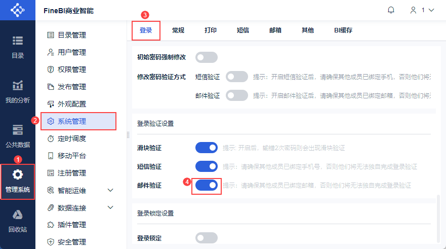 管理员登录FineBI系统,点击「管理系统>系统管理>登录」,在登录验证设置中,开启「邮箱验证」。如下图所示: