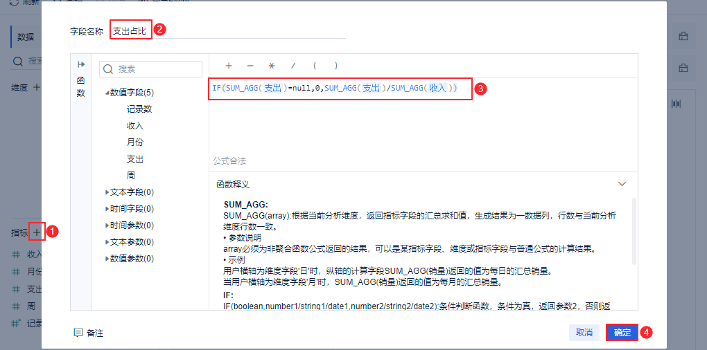 点击「+」添加计算字段,命名为「支出占比」,输入计算公式IF(SUM_AGG(支出)=null,0,SUM_AGG(支出)/SUM_AGG(收入)),点击「确定」,如下图所示: