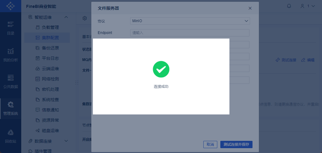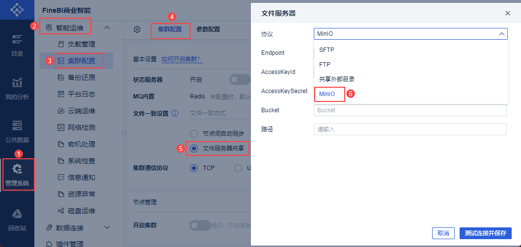 2)管理员进入FineBI系统,点击「管理系统>智能运维>集群配置>文件服务共享」,如下图所示: