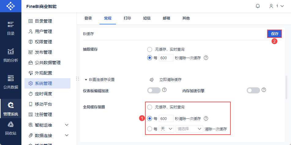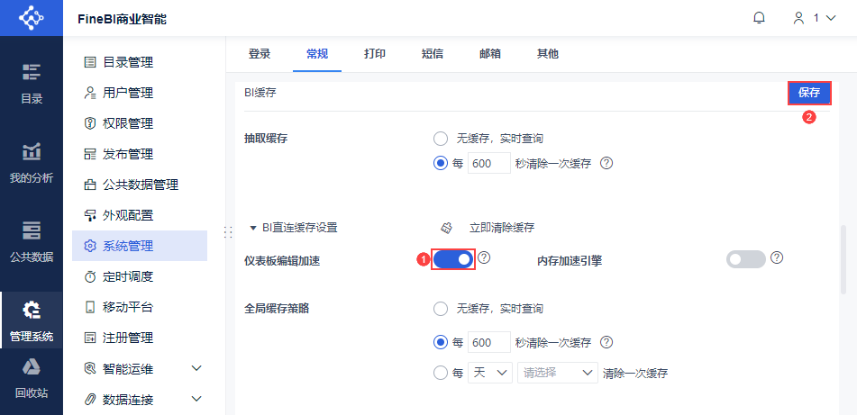 管理员登录FineBI系统,点击「管理系统>系统管理>常规」,可进行「直连缓存」和「抽取缓存」设置。