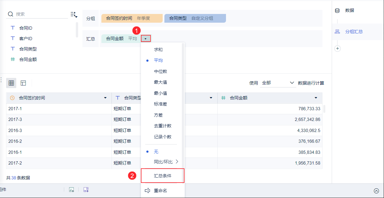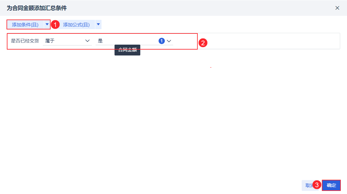 例如,希望得到已交货订单的分组汇总情况。则,点击汇总字段「合同金额>下拉>汇总条件」。如下图所示: