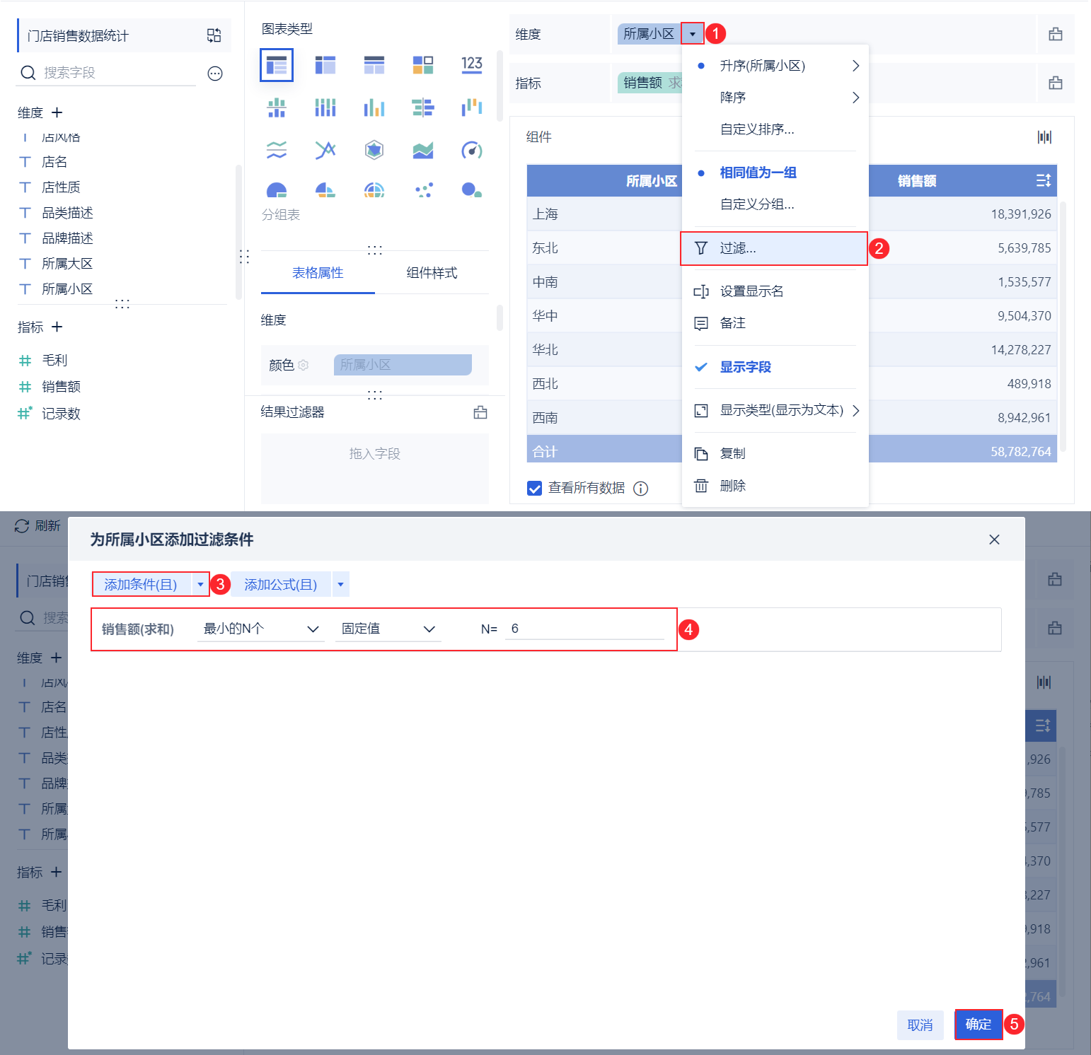 2)点击「所属小区」,选择下拉>过滤,在系统弹出来的过滤设置框中点击添加条件,过滤出销售额排名前六的小区,点击「确定」,如下图所示:
