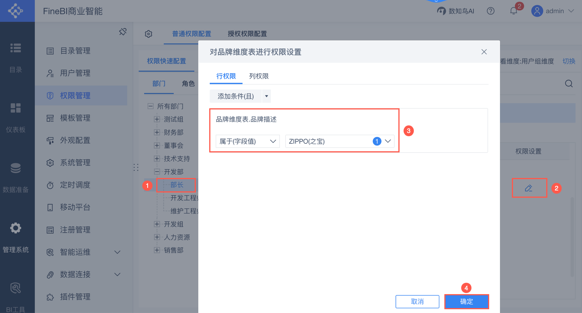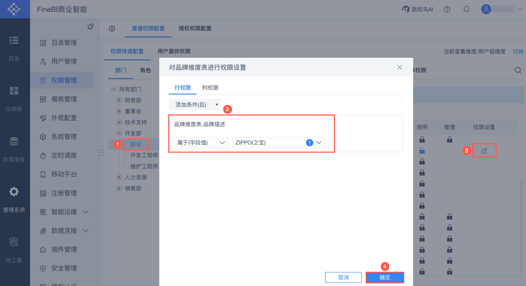 1)为Alice设置部门行权限,开发部部长设置「零售行业>品牌维度表」中的「品牌描述」字段属于「ZIPPO(之宝)」,如下图所示:
