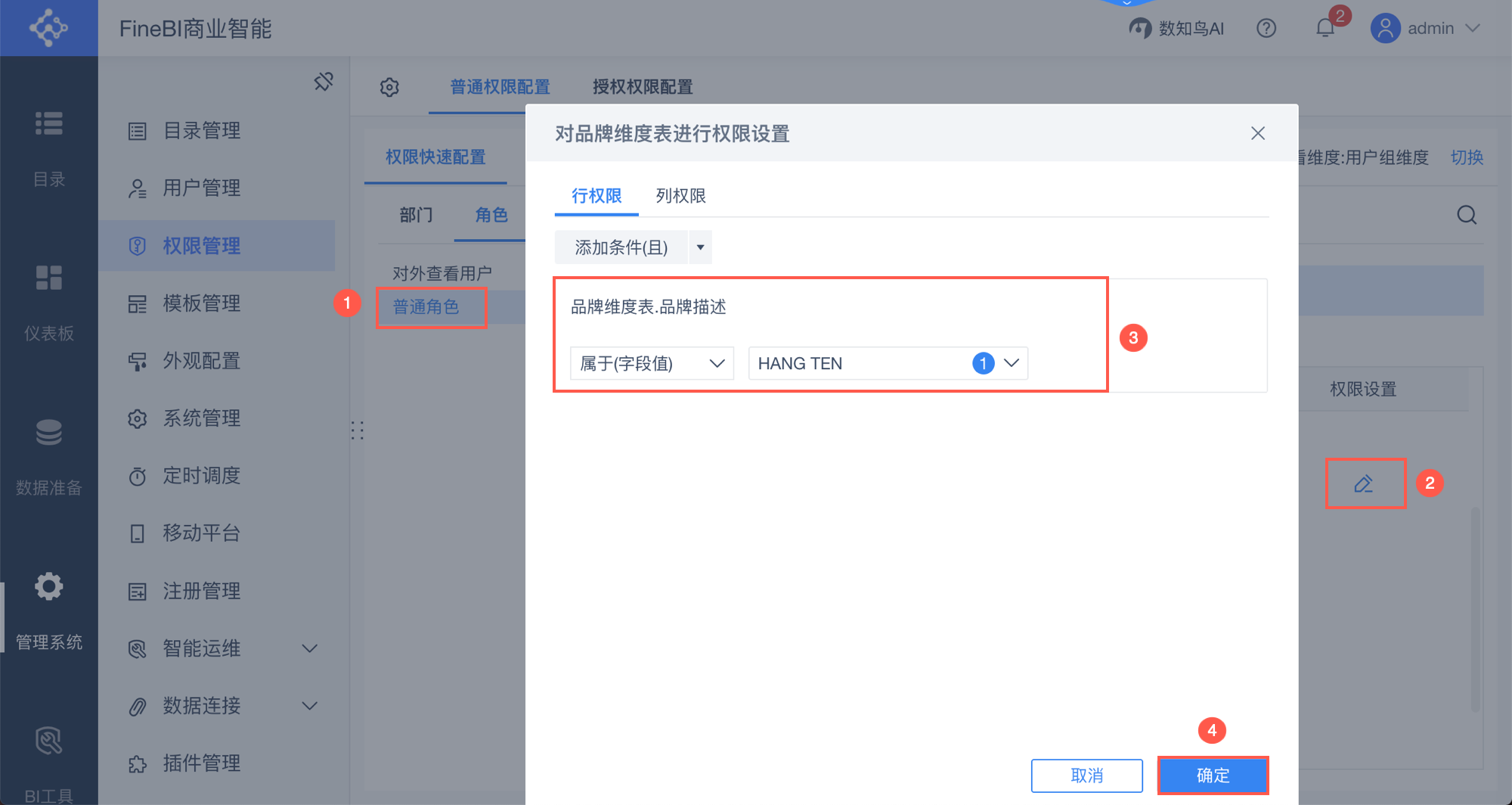 2)为 Alice 设置角色权限,普通角色设置「零售行业>品牌维度表」中的「品牌描述」字段属于「HANG TEN」。如下图所示: