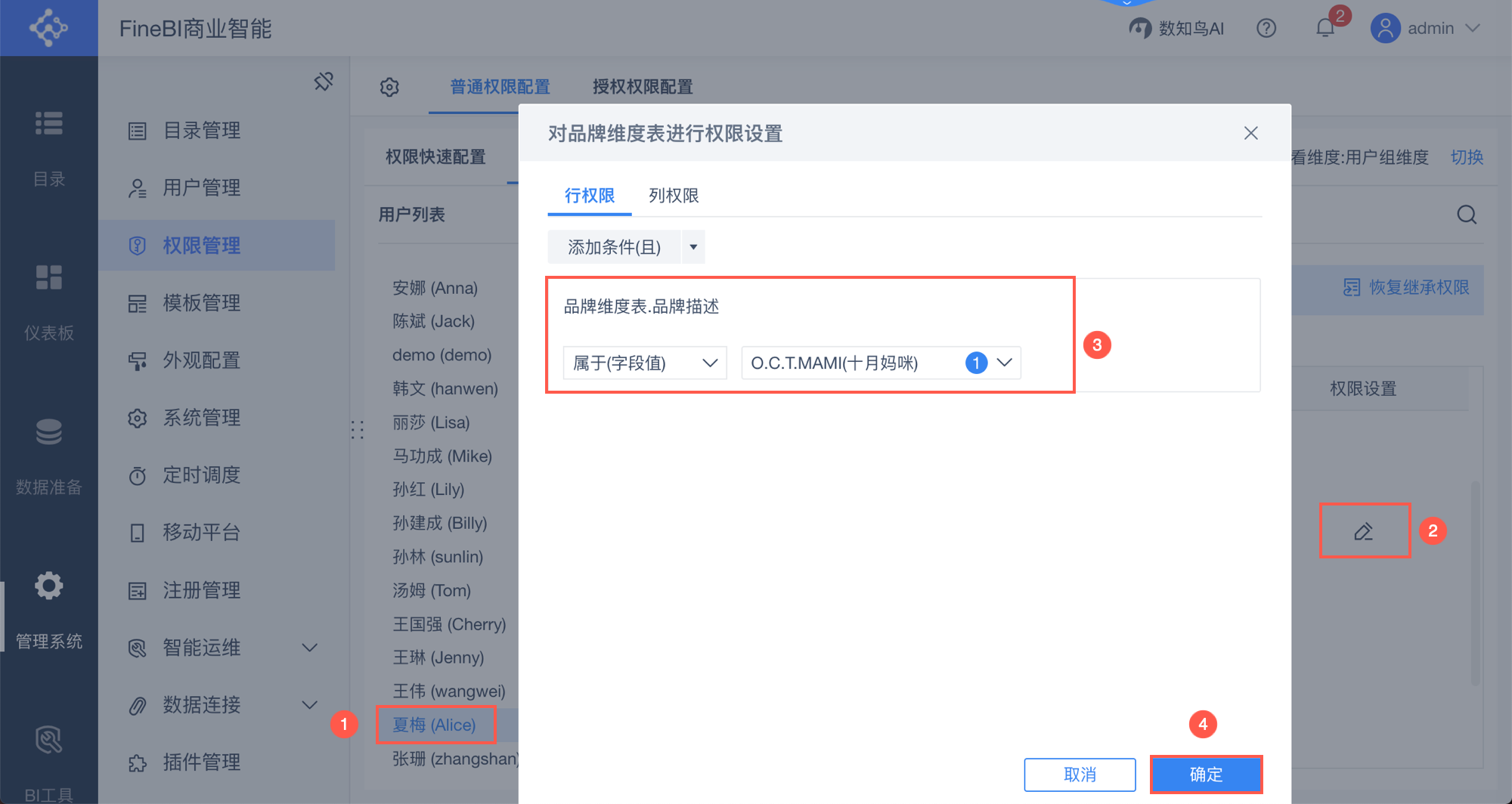 4)为 Alice 设置用户行权限,用户 Alice 设置「零售行业>品牌维度表」中的「品牌描述」属于「十月妈咪」。如下图所示: