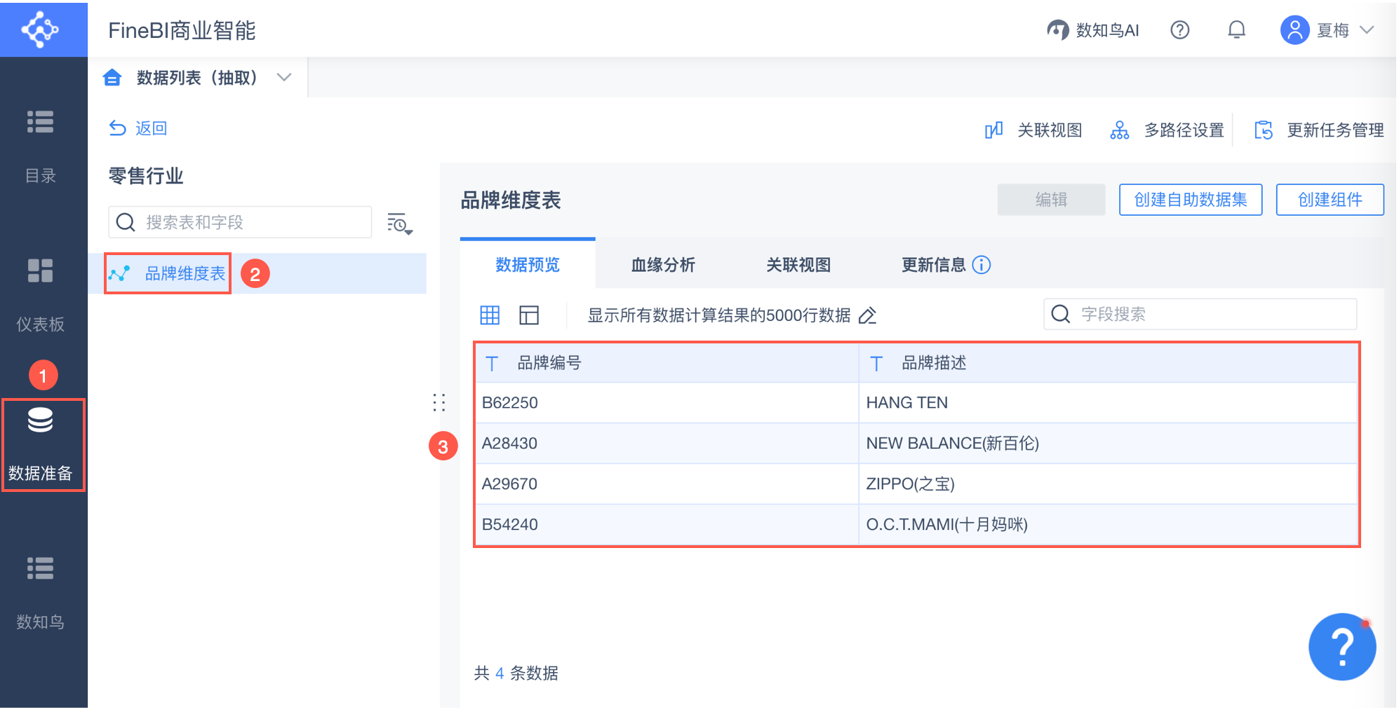 2)技术支持部长设置「零售行业>品牌维度表」中的「品牌描述」字段属于「新百伦」。如下图所示: