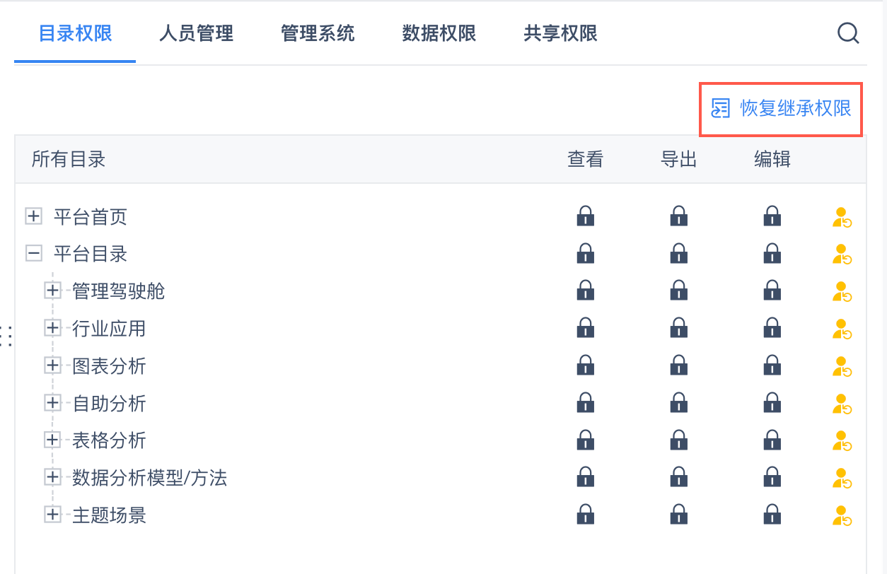 注:若为用户单独设置过使用/管理/授权权限,在设置权限后会出现黄色的人像标志。此时若需要恢复对部门/角色权限的继承,需要点击恢复继承权限按钮。弹出提示框「确定清除该用户关于数据权限的单独权限设置,恢复对部门/角色权限的继承」,点击确定即可。如下图所示: