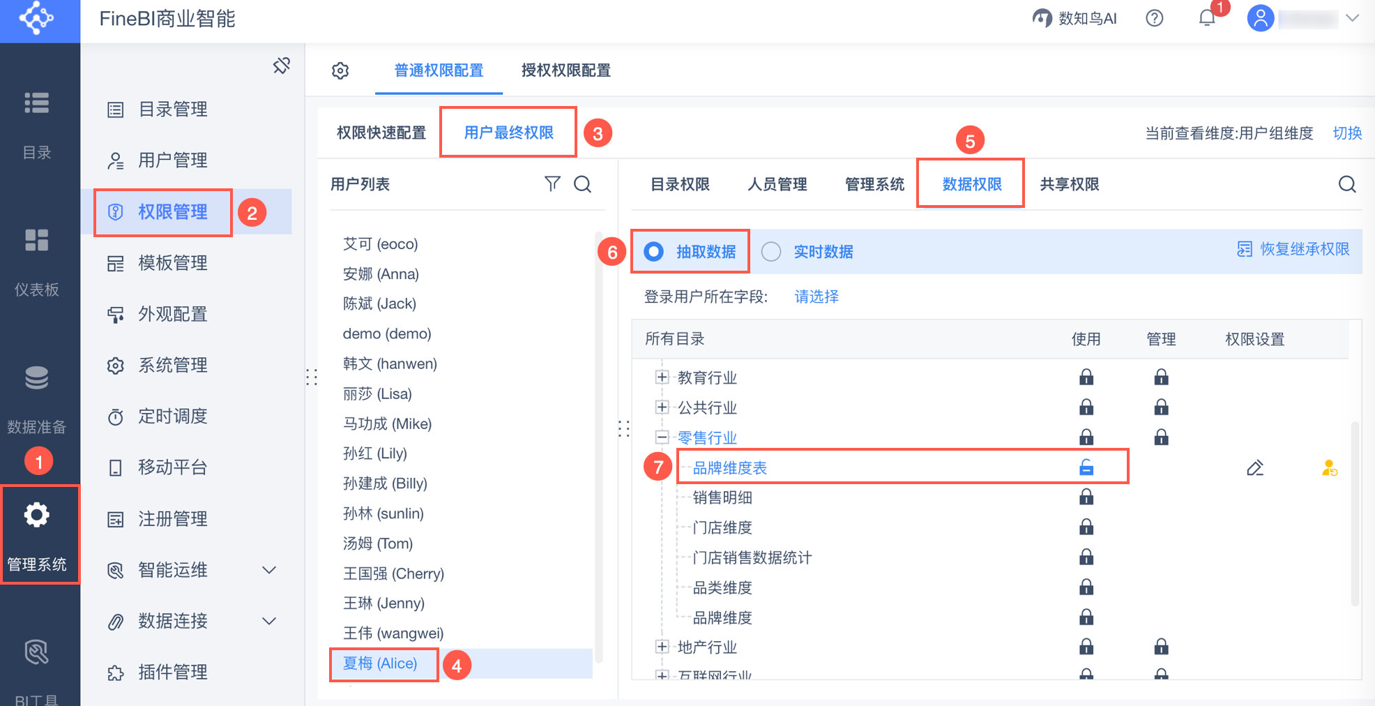 3)为 Alice 设置用户权限,用户 Alice 设置「品牌维度表」的使用权限,不设置行权限。如下图所示: