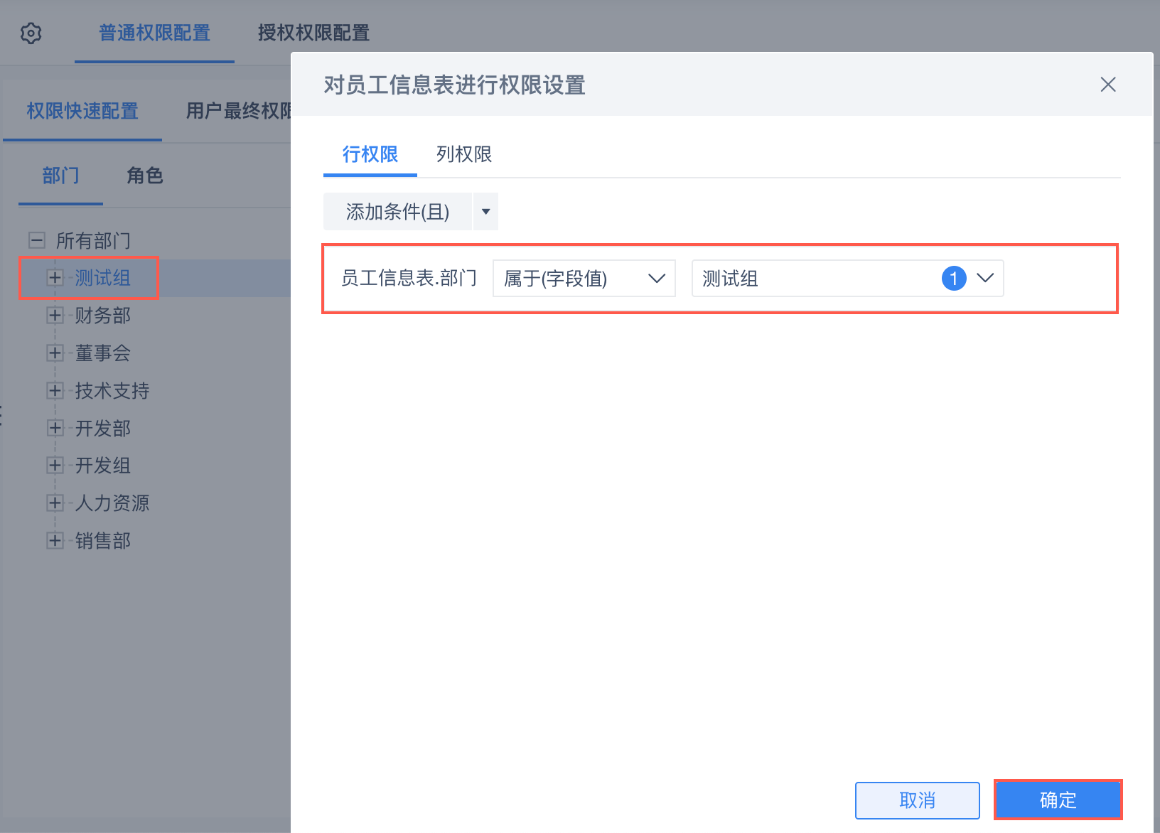 2)用户 Alice 既是产品线 1 的测试组成员,又是产品线 1 的开发组成员。对整个测试组分配员工信息表的权限,设置行权限为员工信息表.部门=测试组,如下图所示: