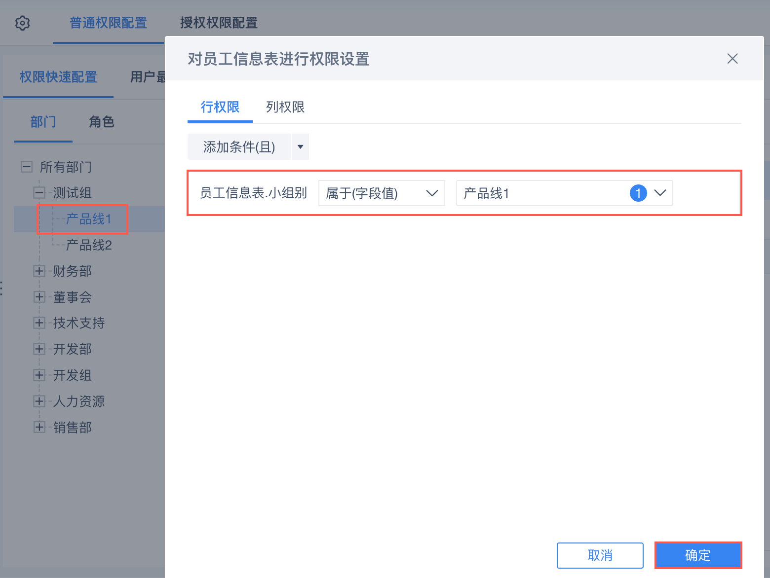 3)对测试组下的产品线 1 组分配员工信息表的权限,添加行权限为员工信息表.小组别=产品线 1 ,如下图所示: